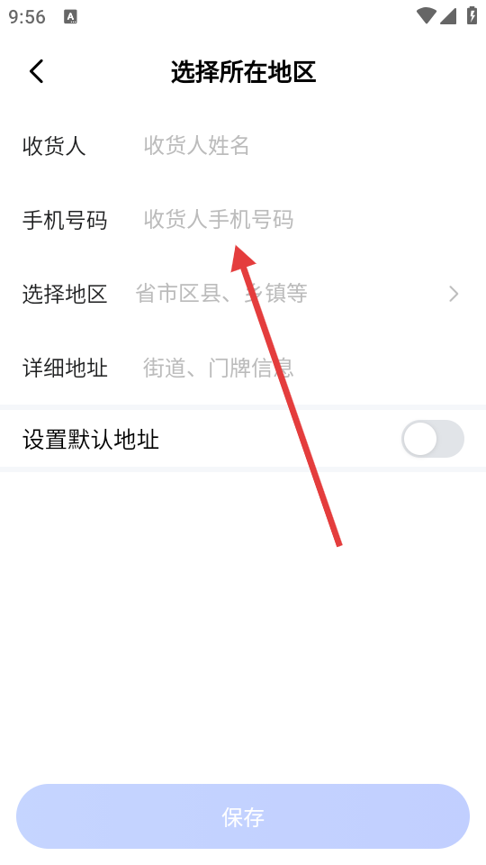 4、在地址编辑页面中,填写【收货人】、【手机号码】、【选择地区】等信息,可设置默认地址后点击保存。