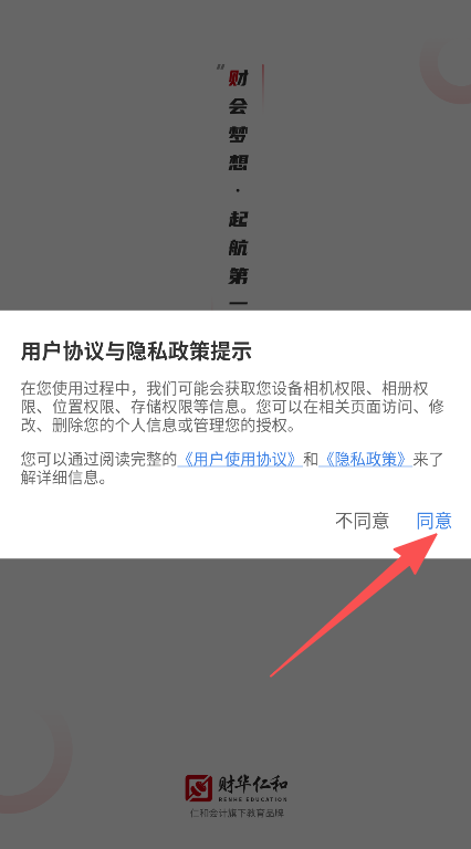 1、首次启动应用在用户协议与隐私政策提示界面点击“同意”。