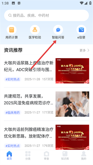 1、打开【用药参考】App,在首页点击【智能问答】选项,进入对应功能页呢。