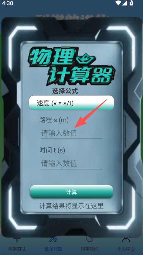 1、打开软件,点击物理公式计算器,选择公式(如速度公式),输入数值,点击计算。