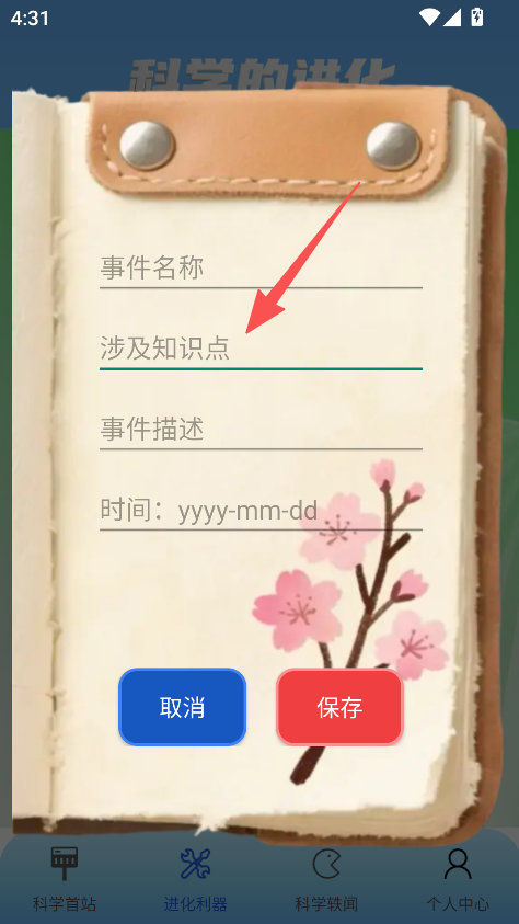 3、记录功能便捷,知识点、事件描述填写保存即可,科学知识记录高效,用户知识管理方便。