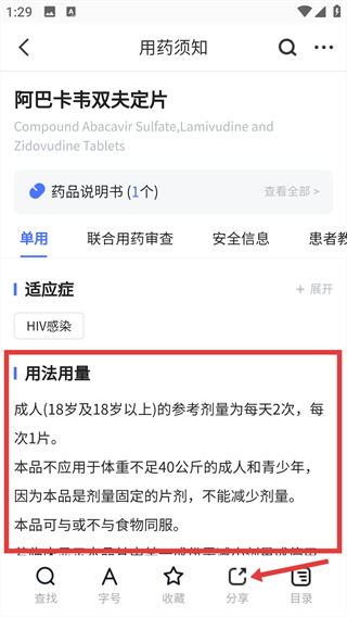 3、进入药品详情页,我们可以仔细阅读【用药须知】,还可以点击底部的【分享】按钮唤起分享选项啦。