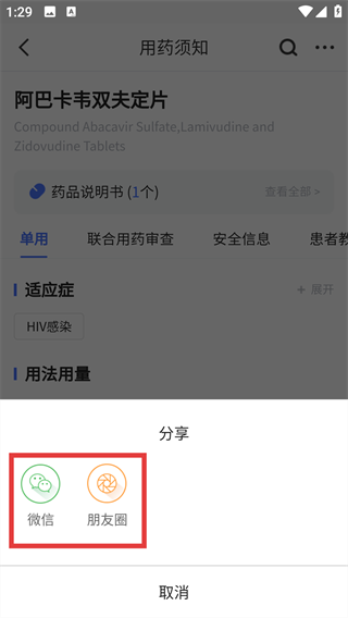 4、在分享选项中,选择【微信】或【朋友圈】即可分享该药品信息啦。