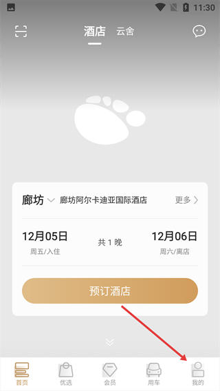 2、在首页中,选择入住离店日期后,点击【预订酒店】按钮以进入酒店列表页面。