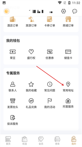 2、在个人中心的专属服务板块,选择【常用地址】选项。