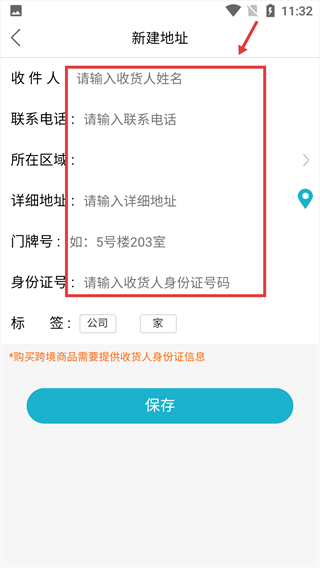 3、点击底部【新增地址】按钮,进入新建地址的信息填写界面。