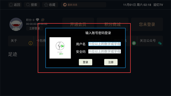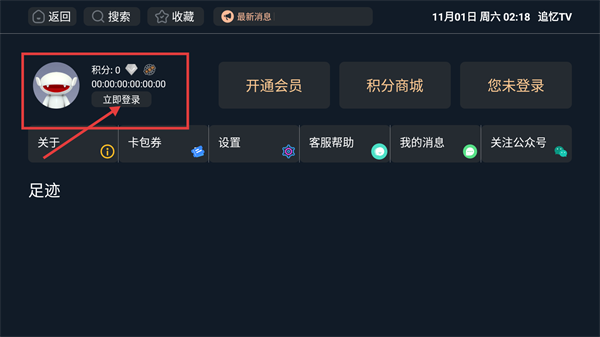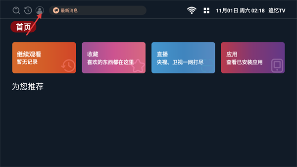 1、在追忆TV首页,点击左上角的个人中心图标,可进入个人中心界面。