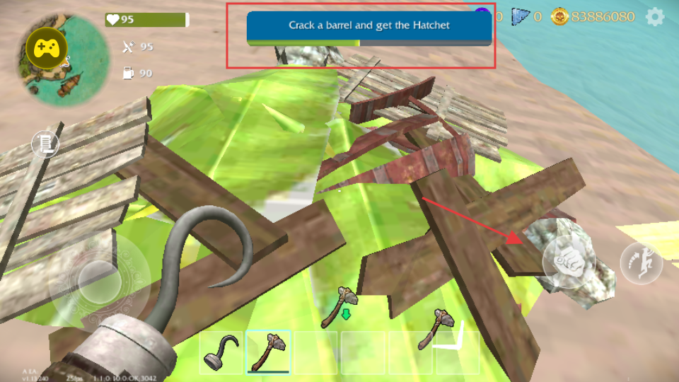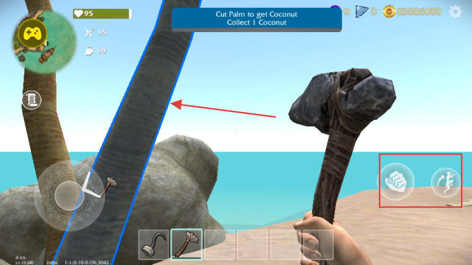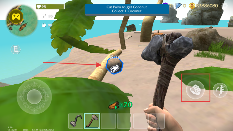 1、跟随任务提示,使用斧头砍伐棕榈树获取椰子,满足生存资源需求。