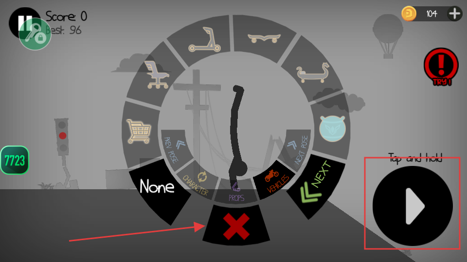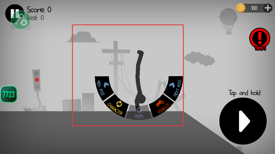 2、在角色设置界面,可调整火柴人的姿态、选择道具和车辆等,自定义游戏体验,增加玩法多样性。