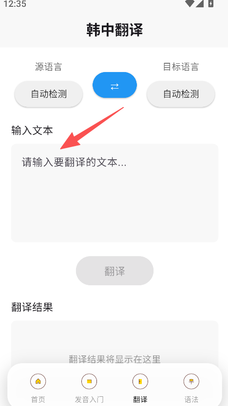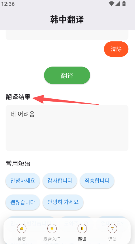 2、翻译实用便捷,支持韩中互译,输入文本即可获取翻译结果,还有常用短语参考,用户学习词汇、进行日常交流时参考性强。