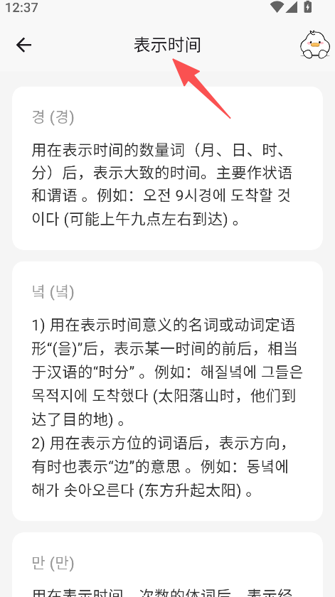 2、支持语法学习功能,讲解韩语语法点,如表示时间的语法,举例说明用法,用户掌握韩语语法规则,提升语法应用能力。