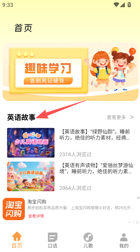 3、进入首页,浏览英语故事,提升英语兴趣。