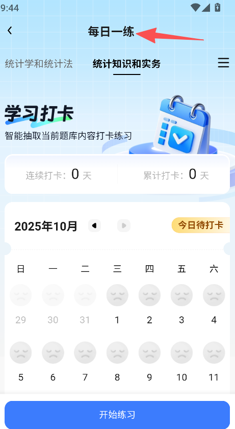 1、打开软件,进入每日一练,选择统计知识和实务板块。