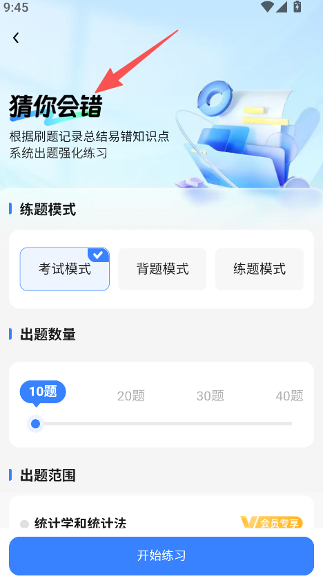 2、进入猜你会错,了解练题模式、出题数量等设置。