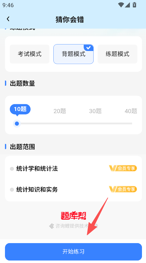 3、选择背题模式等,点击开始练习,开展备考刷题。