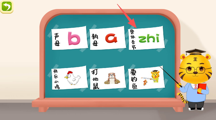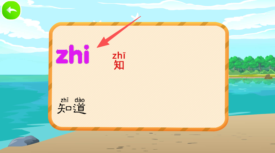 2、在拼音界面,学习声母、韵母、整体音节(如zhi)。