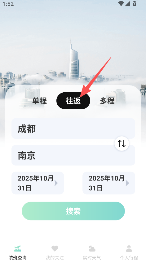 1、进入航班查询板块,选择往返类型,设置出发地、目的地及日期。