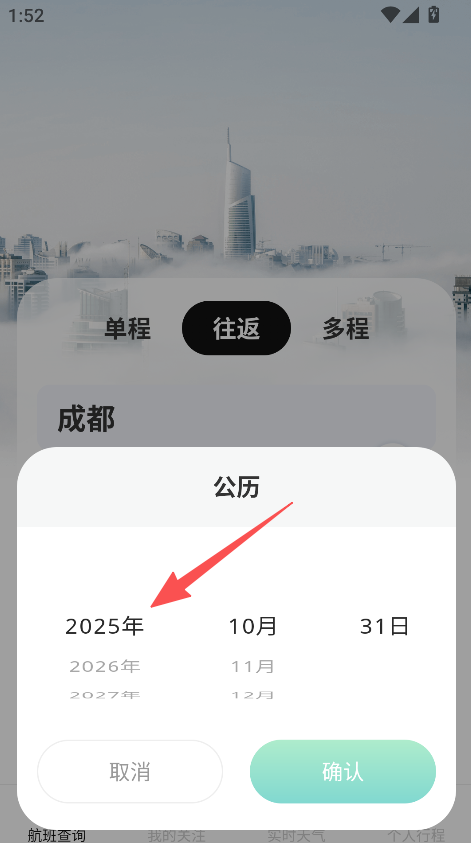 2、选择具体年份、月份、日期,确认后搜索航班。