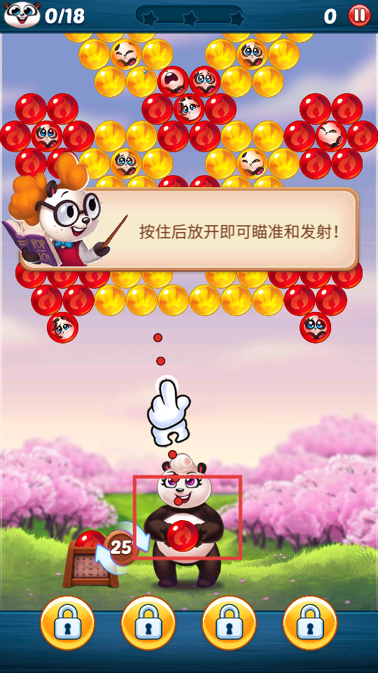 2、按住后放开瞄准和发射泡泡,消除同色泡泡,完成关卡目标。