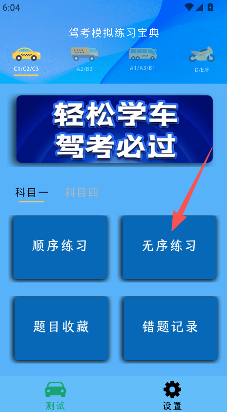 1、选择对应车型后,进入科目一板块,选择无序练习等模式。
