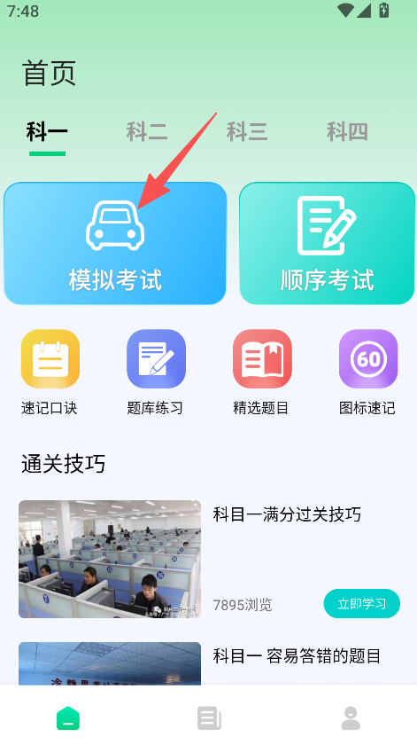 1、进入首页科一板块,选择模拟考试,开始科目一模拟答题。