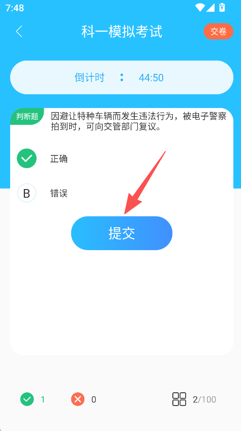 2、在模拟考试中,答题后点击提交,查看答题结果。