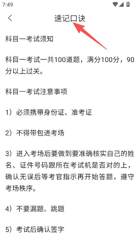 3、进入速记口诀板块,学习科目一考试须知等关键信息,巩固备考知识。