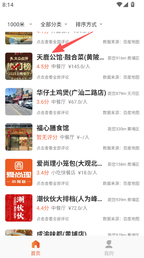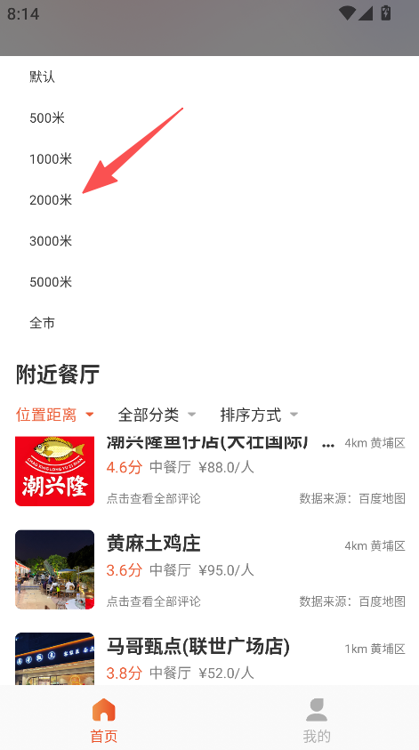 1、进入首页,选择距离范围,筛选附近餐厅。