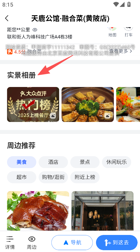 3、进入餐厅详情页,查看实景相册,了解餐厅环境与菜品。