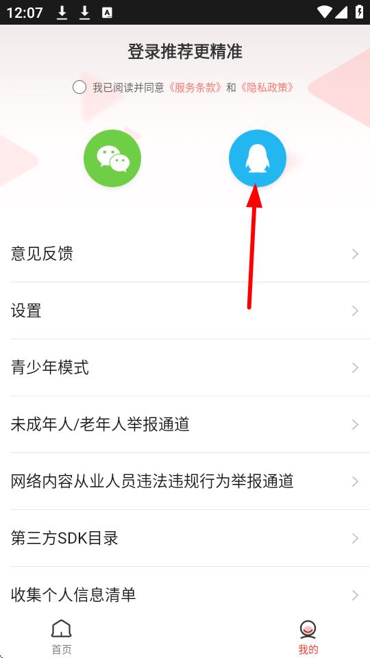 3、勾选【我已阅读并同意《服务条款》和《隐私政策》】后,点击蓝色QQ图标进行登录。