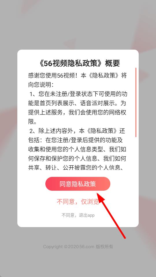 1、点击【同意隐私政策】按钮以继续使用56视频。