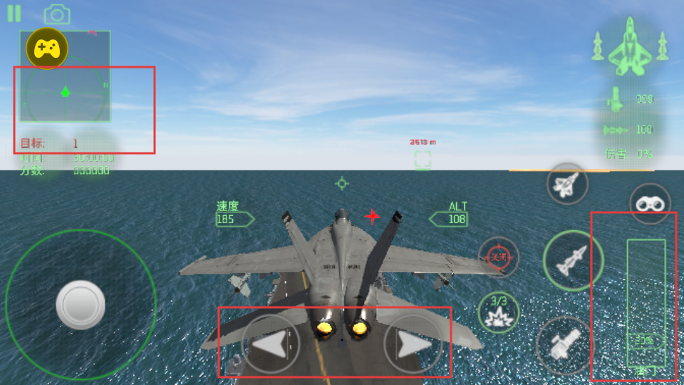 2、通过左侧虚拟摇杆控制战机移动方向,下方方向按钮调整战机姿态,右侧武器按钮释放导弹等攻击,关注雷达和目标提示,精准打击敌人。