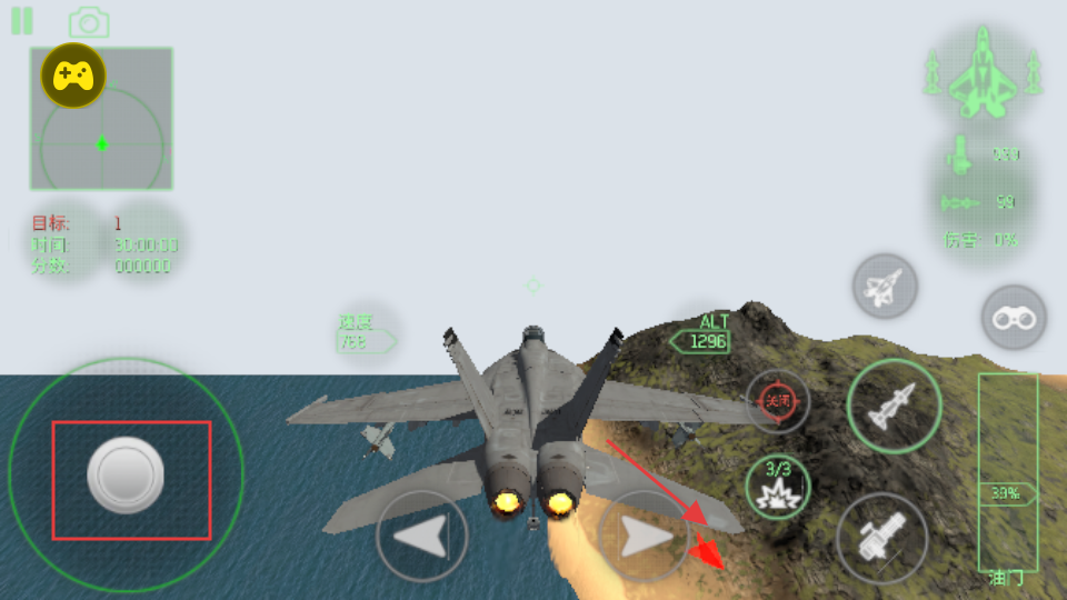3、飞行中注意战机速度、高度和油门等参数,根据场景和任务需求调整,根据箭头的提示调整飞机飞行。