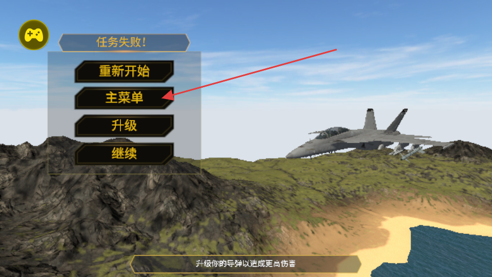 4、若任务失败,可选择“主菜单”调整战机装备、升级武器后再尝试,不断提升空战技巧,争取完成战役任务。