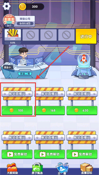 1、积累至少【100】金币,点击【解锁直播间】-【100】按钮,解锁新直播间扩大平台。