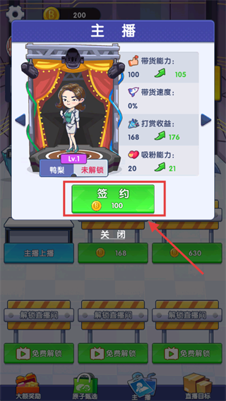 2、拥有【100】金币时,点击【签约】-【100】按钮,签约【鸭梨】主播提升带货能力。