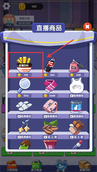 3、花费【100】金币选择【直播目标】商品直播,完成订单获取收益与进度。
