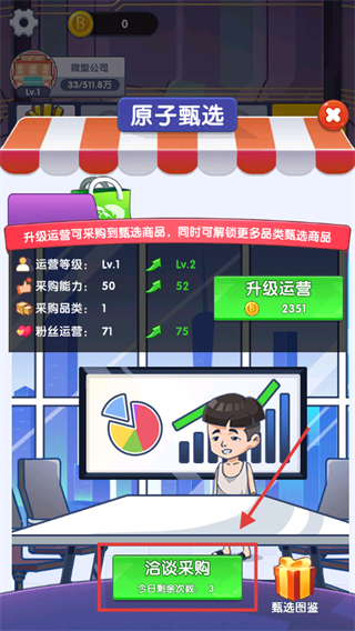 4、点击【洽谈采购】按钮,每日3次机会采购商品,或升级运营解锁更多品类。
