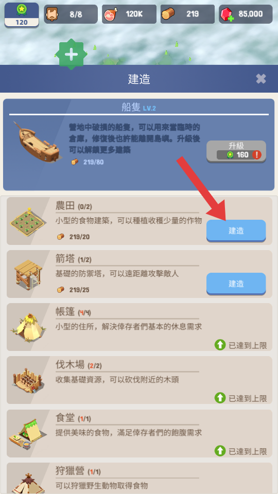 2、在建造界面中,选择需要建造的建筑(如农田),点击【建造】按钮,消耗资源进行建造。