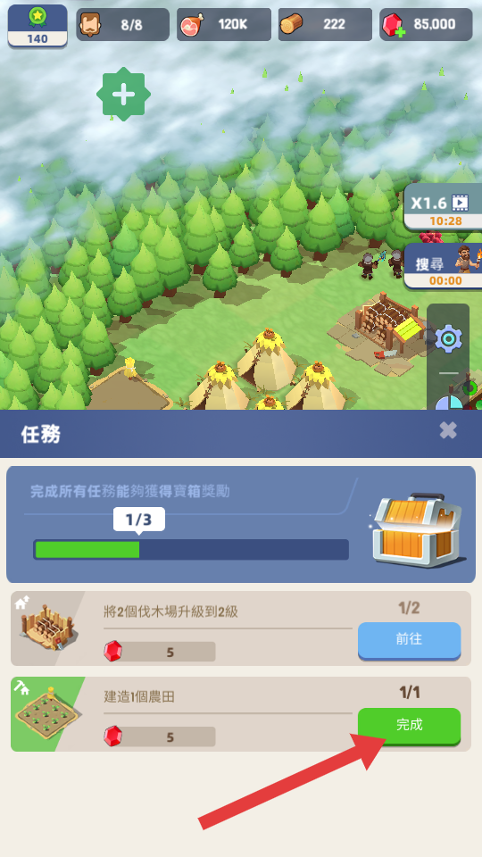4、完成建筑建造后,进入任务界面,点击已完成任务右侧的【完成】按钮,领取任务奖励,推进游戏进程。
