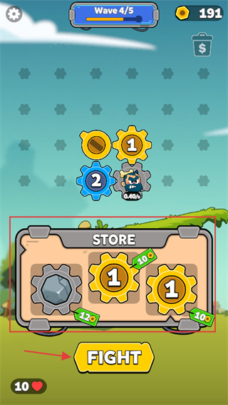2、利用“REROLL”功能刷新齿轮角色,尝试获取更高等级的角色,提升战力,为战斗做好准备,之后点击“FIGHT”开启战斗。