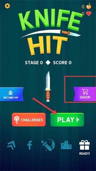 1、在主界面点击【SHOP】按钮进入商店,可查看并获取不同的飞刀武器。