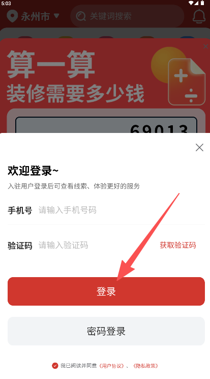 1、在界面输入正确的手机号码与收到的短信验证码“登录”。