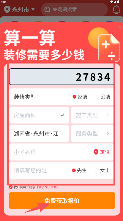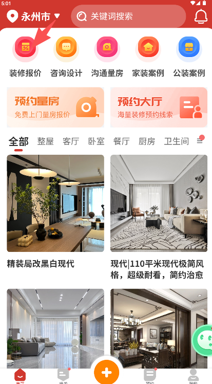 2、进入首页定位所在地区等关键信息选择“装修报价”。