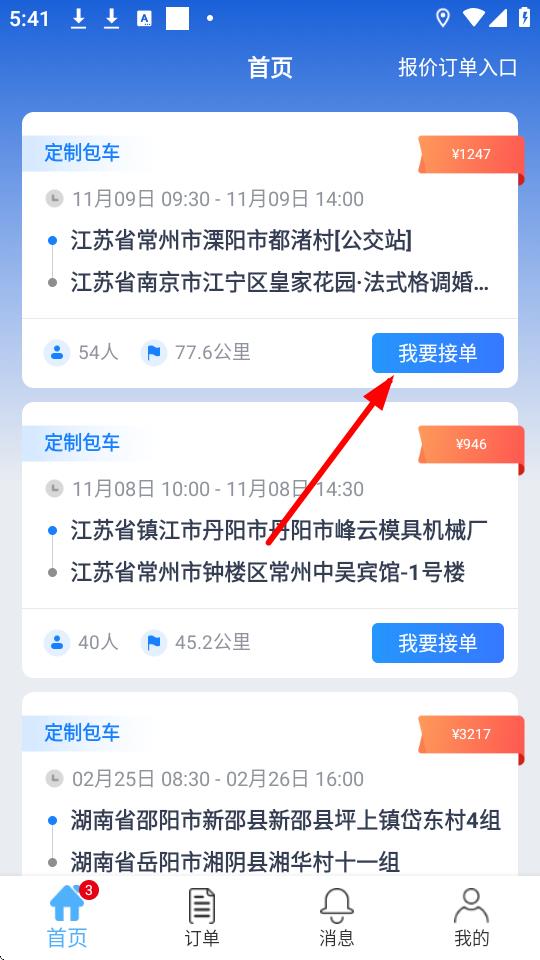 2、在首页看到定制包车订单后,点击【我要接单】可接该订单。
