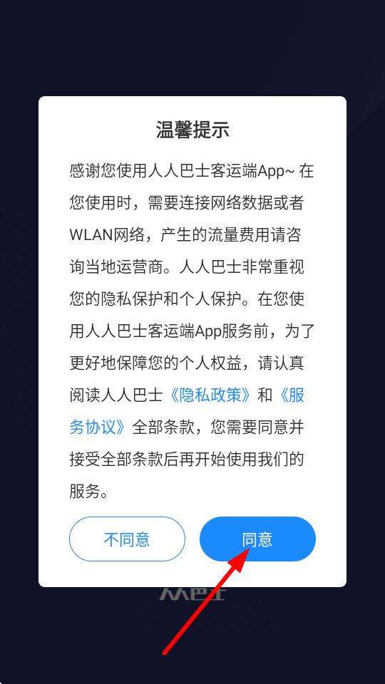 1、使用人人巴士客运端前,需阅读【隐私政策】和【服务协议】,点击【同意】后可开始使用。