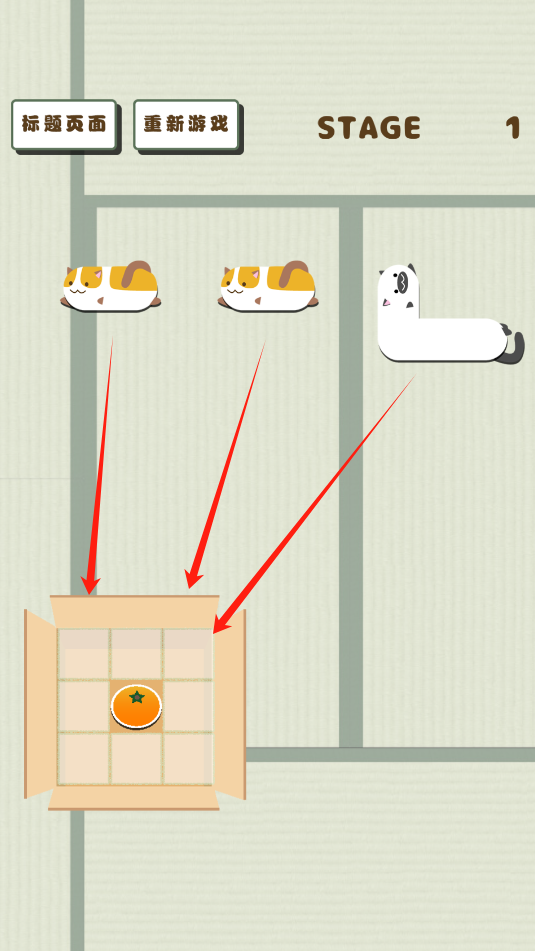 3、点击上面的三只猫咪变换身躯,把三只猫咪放置进入纸箱即可通关。