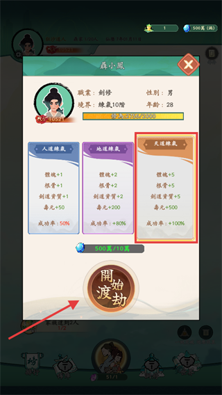 3、选【天道练气】渡劫,耗【500万】,点【开始渡劫】,属性大涨成功率满。