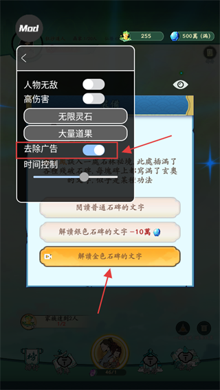 3、开【去除广告】免干扰,解读【金色石碑】文字学新功法,提升角色能力。