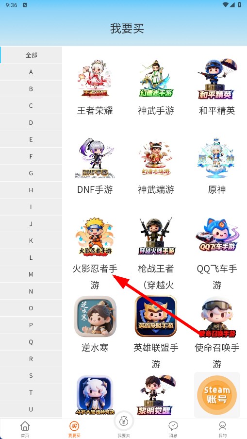 1、进入【我要买】页面,可挑选【火影忍者手游】等热门游戏账号,满足购买需求。